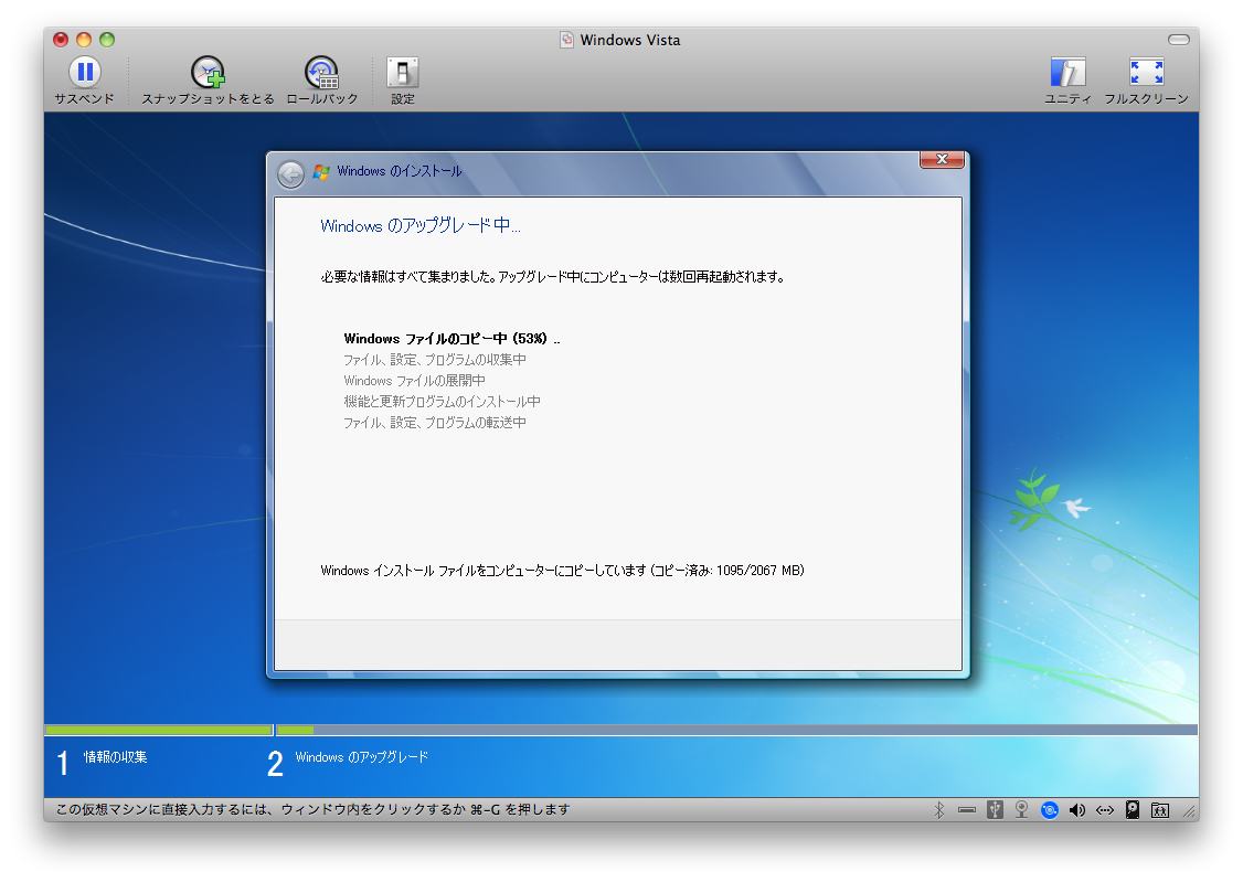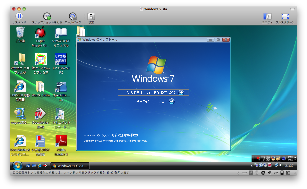 MacにてFusion3から、Vistaを立ち上げ、Windows7へのアップグレードCDをセット。