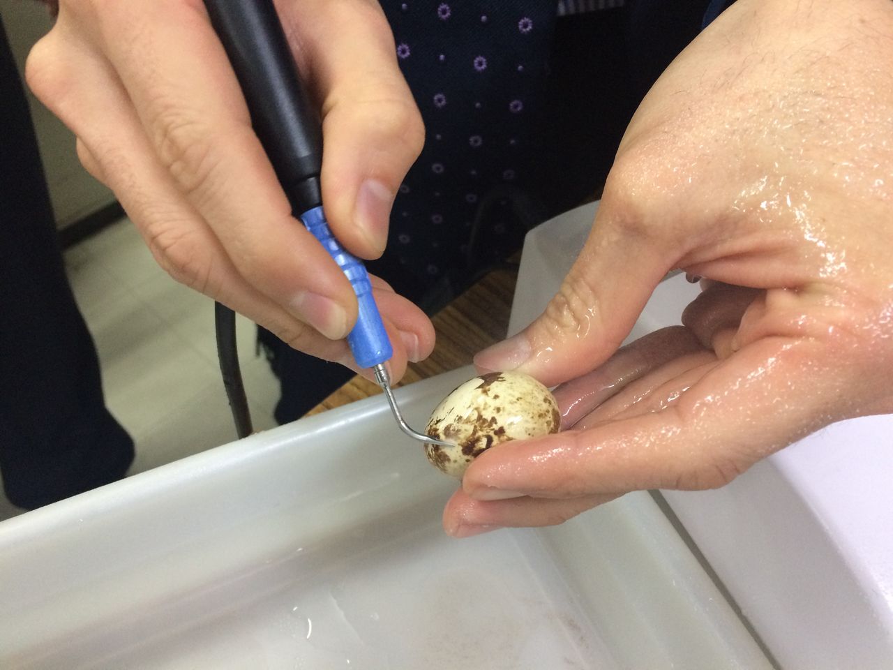 デンツプライ三金さんのデモでは、ウズラの卵を使用します