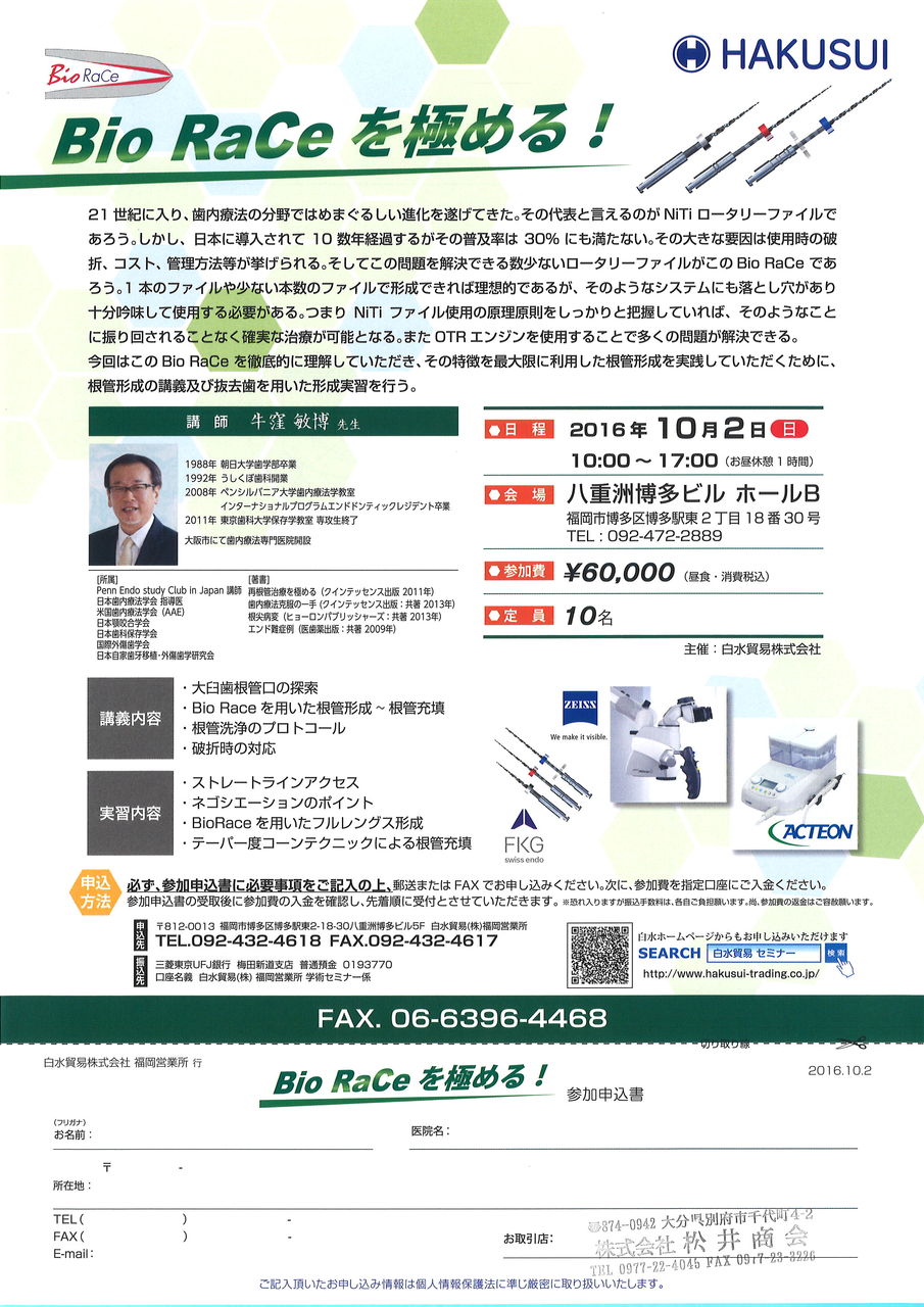 【内容】大臼歯根管口の探索、Bio Raceを用いた根管形成〜充填、洗浄のコントロール、破折時の対応