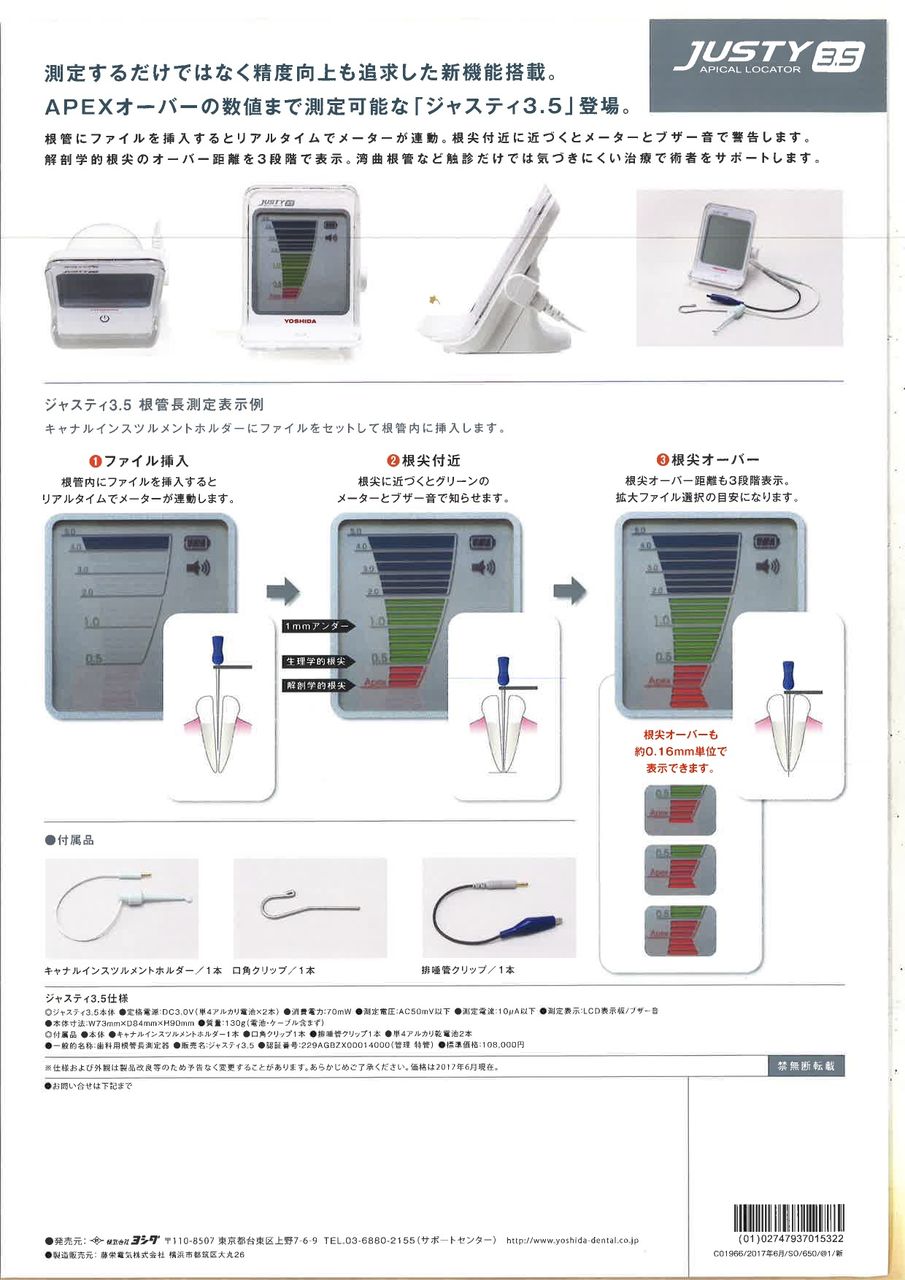 根管長測定器のジャスティーの新型が登場!わずか103gの軽量で、従来と比較して30%コンパクトになりました。2種類の周波数の組み合わせから常に整合性を確認する「統合補正システム」を搭載。口腔内の環境に影響されずドライでもウェットでも測定できます。9/20まで新発売キャンペーンを行っておりますので、この機会にお求めください。定価108,000円