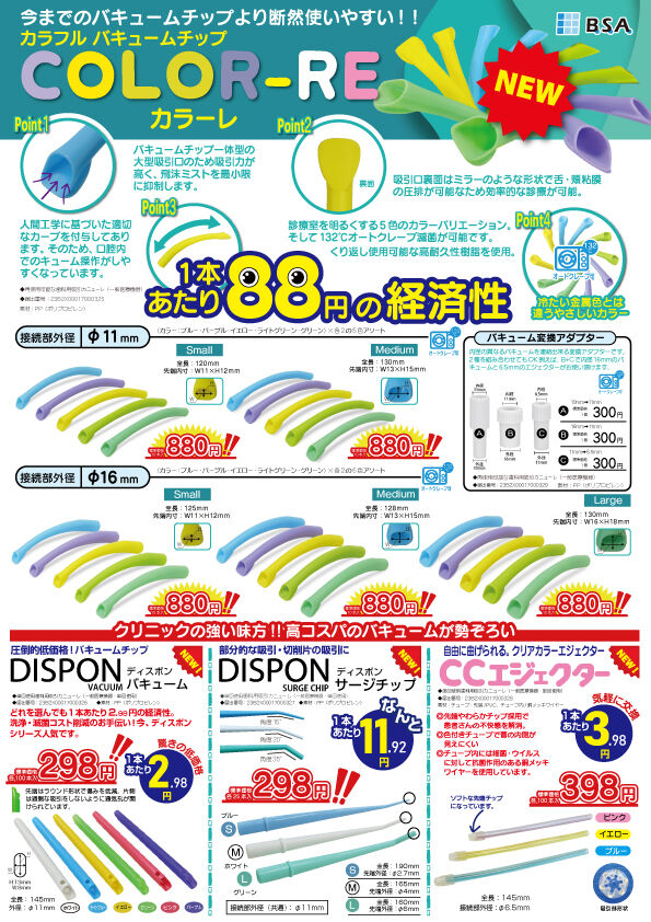 冷たい金属色とは違う優しいカラー、しかも1本88円と低コスト!診療室を明るくする5色のカラーバリエーション。高耐久樹脂の使用により、132度のオートクレーブ滅菌も可能です。カラフルで人間工学に基づいた適切なカーブを付与しており、口腔内での操作が容易。吸引口が大きいため吸引力が高く、飛沫ミストを最小限に抑制します。吸引口の裏面はミラーのような形状で舌・頬粘膜の圧排が可能なため効率的な診療が可能です。11φスモール、ラージ各10本入880円