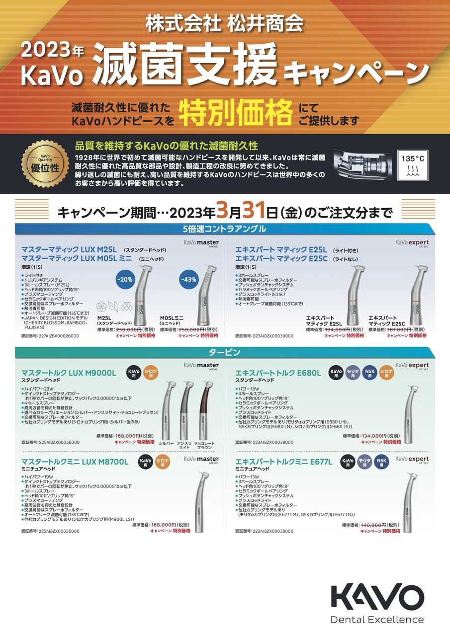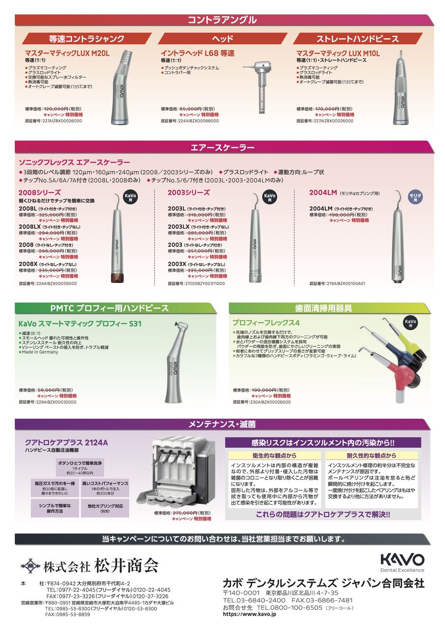 世界で初めて滅菌可能なハンドピースを開発して以来、滅菌耐久性に優れた高品質なKaVo製品を特別価格にてご提供いたします。タービン、5倍速コントラ、エアースケーラーやPMTC用ハンドピースピース、歯面清掃器のプロフィーフレックス等を特別価格にてご提供致します。4/1より価格改定にて値上がりが決まっておりますので、この機会に是非ともお求め下さい