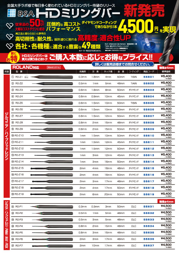 従来品の50% OFF、ダイヤモンドコーティングでありながら、1本4,500円〜と、圧倒的な高コストパフォーマンス。純正品と変わらないと評判の高切削性と耐久性、設計通りに削れる高精度で適合性アップ。各社・各機械に適合(ROLAND、CANON、Aadva、ARUM)する豊富な49種類をラインナップしております。買えば買うほどお得な企画もご用意しております